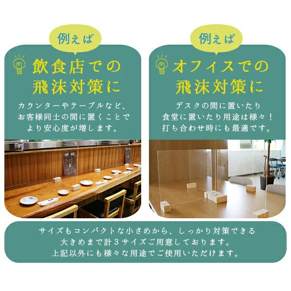 商品の特徴 飛沫ガード、飛沫予防衝立、感染予防 飛沫を物理的に軽減!! オフィスの受付けや商談スペース、食堂などにピッタリ! 人が対面になる場所ならどこにでも簡単に設置できる飛沫ガードパネル。