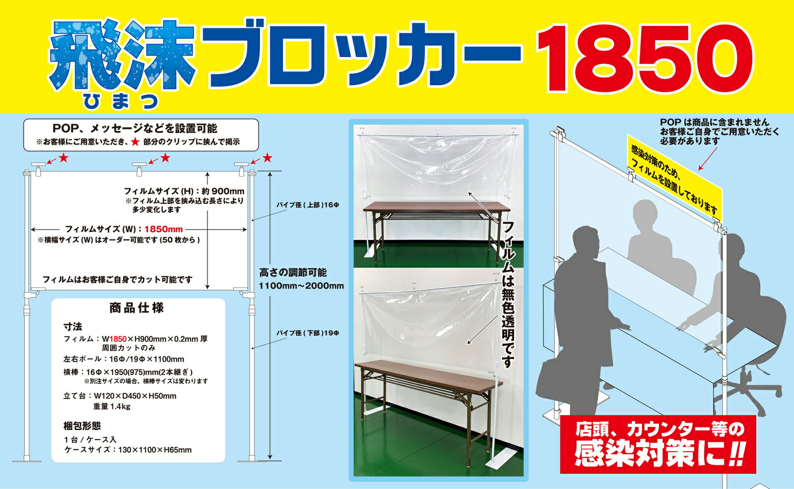 店頭、カウンター等 の感染対策に! 左右ポール:直径16/19*1100mPOPメッセージなどを設置可能(POPは商品に含まれません) 高さ調節可能(1100〜2000mm) フィルム:サイズ縦900*巾1850mm(約) 材質:透明塩ビ0.2mm厚 2