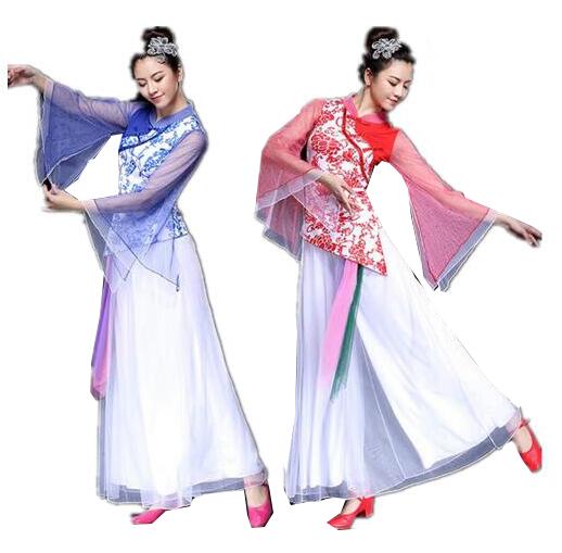 民族踊りダンス衣装 スカート風パンツ+tシャツ2点セット シフォン飄逸な演出パンツドレス 改良漢服 レイヤード風 古筝演奏衣装 扇子舞剣舞太極拳演舞舞台ステージ衣装 楽器演奏衣装 エスニック レッスン団体衣装